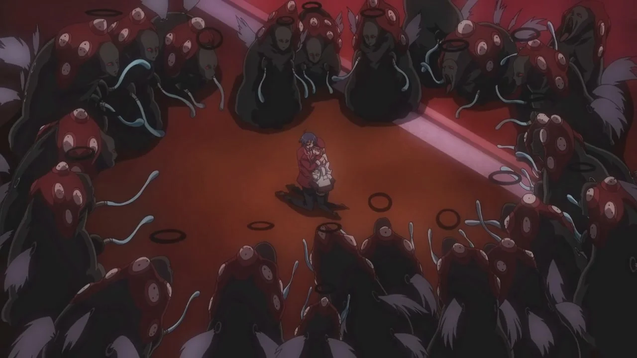 Какэру Сацуки вырос в приюте. Когда его старшая сестра покончила с собой, 10-летний мальчик тоже потерял волю к жизни и спасся лишь благодаря помощи и поддержке ещё одной сироты, Юки. Прошло семь лет. Юка счастлива в приемной семье Минасэ, Какэру живет один, но учится в одном классе с подругой детства. Тем не менее главный герой из-за детской травмы и повязки на правом глазу остается мрачным и нелюдимым парнем и кроме Юки свободно общается в классе разве что с парой человек – местным комиком Тадаси и его строгой подружкой Каори. Вот с ними Сацуки и Минасэ и собрались на распродажу в местный супермаркет. Но не дошли. За несколько мучительных мгновений мир окрасился багрянцем, а на небе застыла черная луна. Город Аямэгаока остался, а люди исчезли. Так началось знакомство героев с миром Красной Ночи.